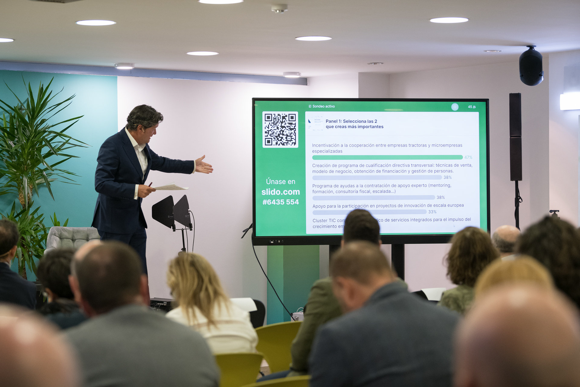 En la Mesa de consenso “AsturIAS Digital”, se ordenaron por prioridad mediante votación con QR las propuestas trabajadas el día anterior. En Competitividad del sector TIC (6 propuestas) se planteó reforzar la capacitación directiva (ventas, modelo de negocio, financiación y gestión de personas), habilitar ayudas para contar con apoyo experto, empujar la participación en proyectos europeos, promover alianzas entre tractoras y microempresas, facilitar fusiones para ganar tamaño y situar al Cluster TIC como hub de servicios integrados.