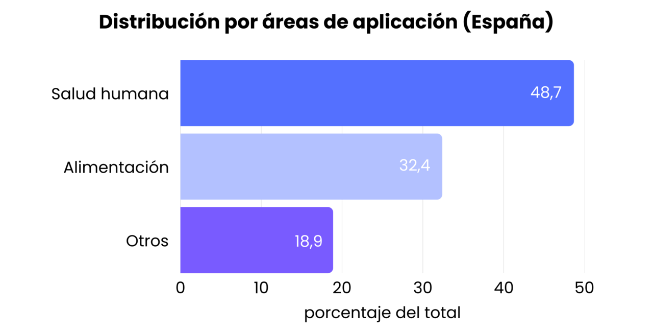 La biotecnología en España tiene un alcance transversal. Las principales áreas de aplicación de la biotecnología en España son la salud humana (48,7%) y la alimentación (32,4%), seguidas de agricultura y producción forestal (26,4%), medioambiente (19,8%), salud animal y acuicultura (17,8%) e industria (15,2%). (Estos porcentajes no son excluyentes, ya que muchas empresas desarrollan actividad en varios ámbitos simultáneamente).