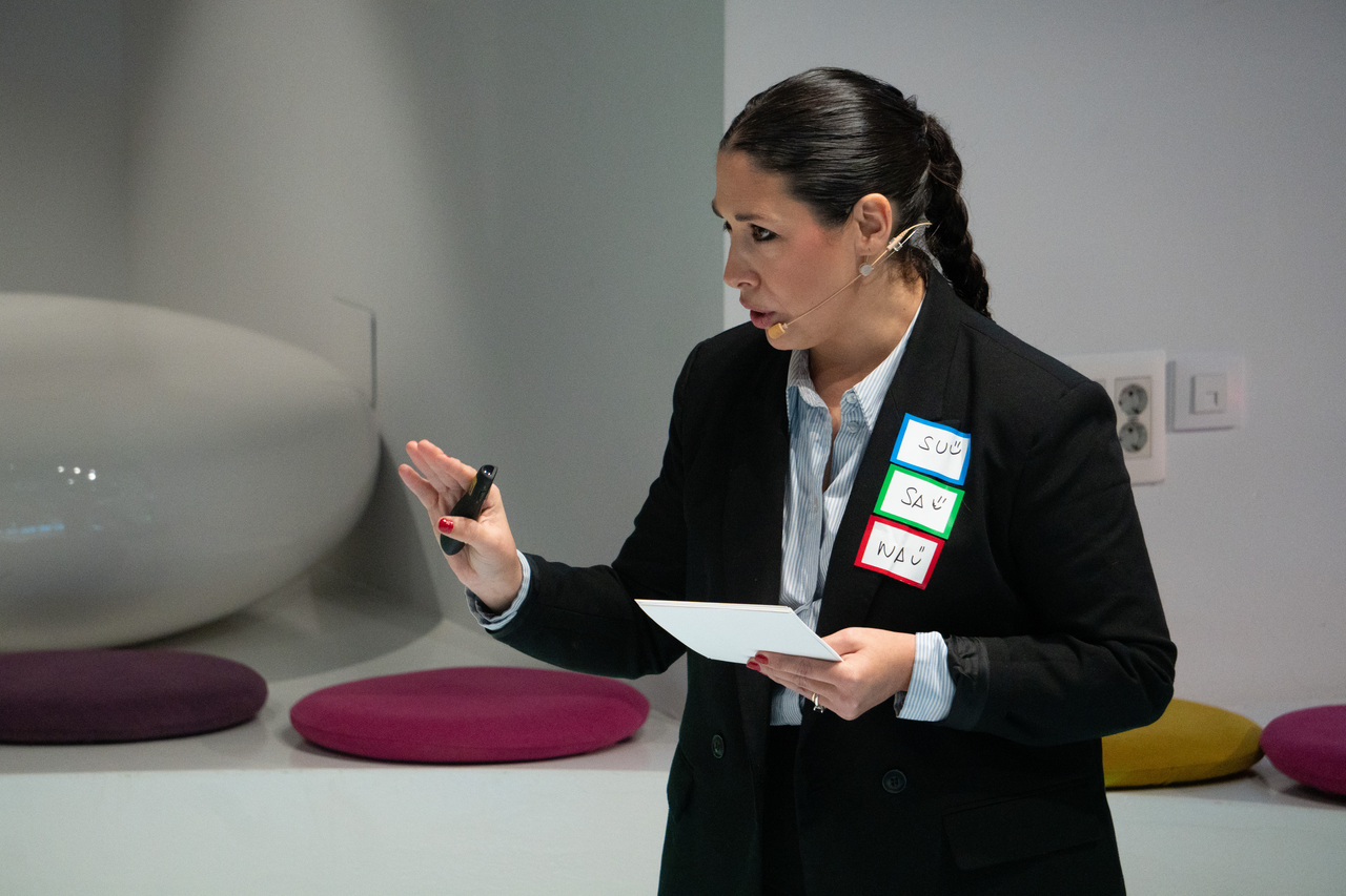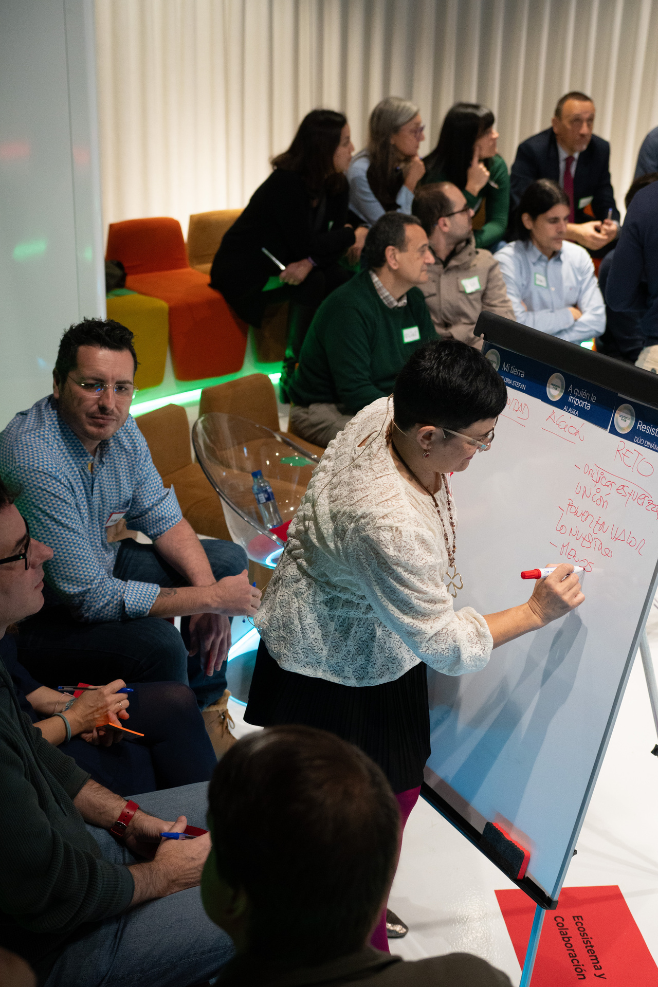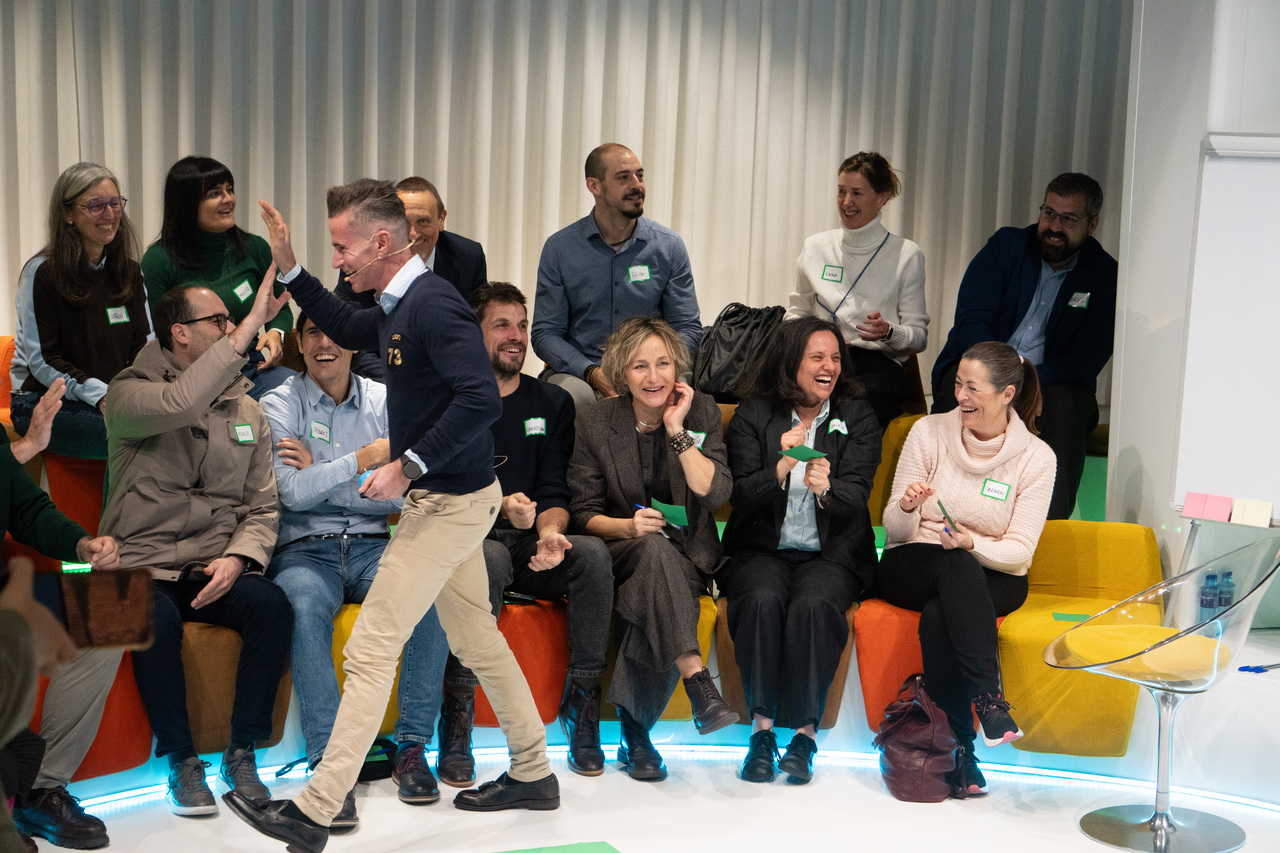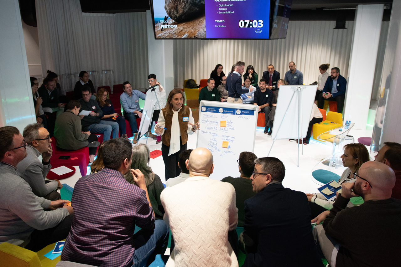 La segunda dinámica, ya en grupos, se estructuró por colores -rojo, verde y azul- y giró en torno a un juego musical que sirvió de excusa para identificar retos, oportunidades y acciones, con una condición clara: las palabras talento, digitalización y sostenibilidad estaban prohibidas. El objetivo era pensar fuera de los discursos habituales.
