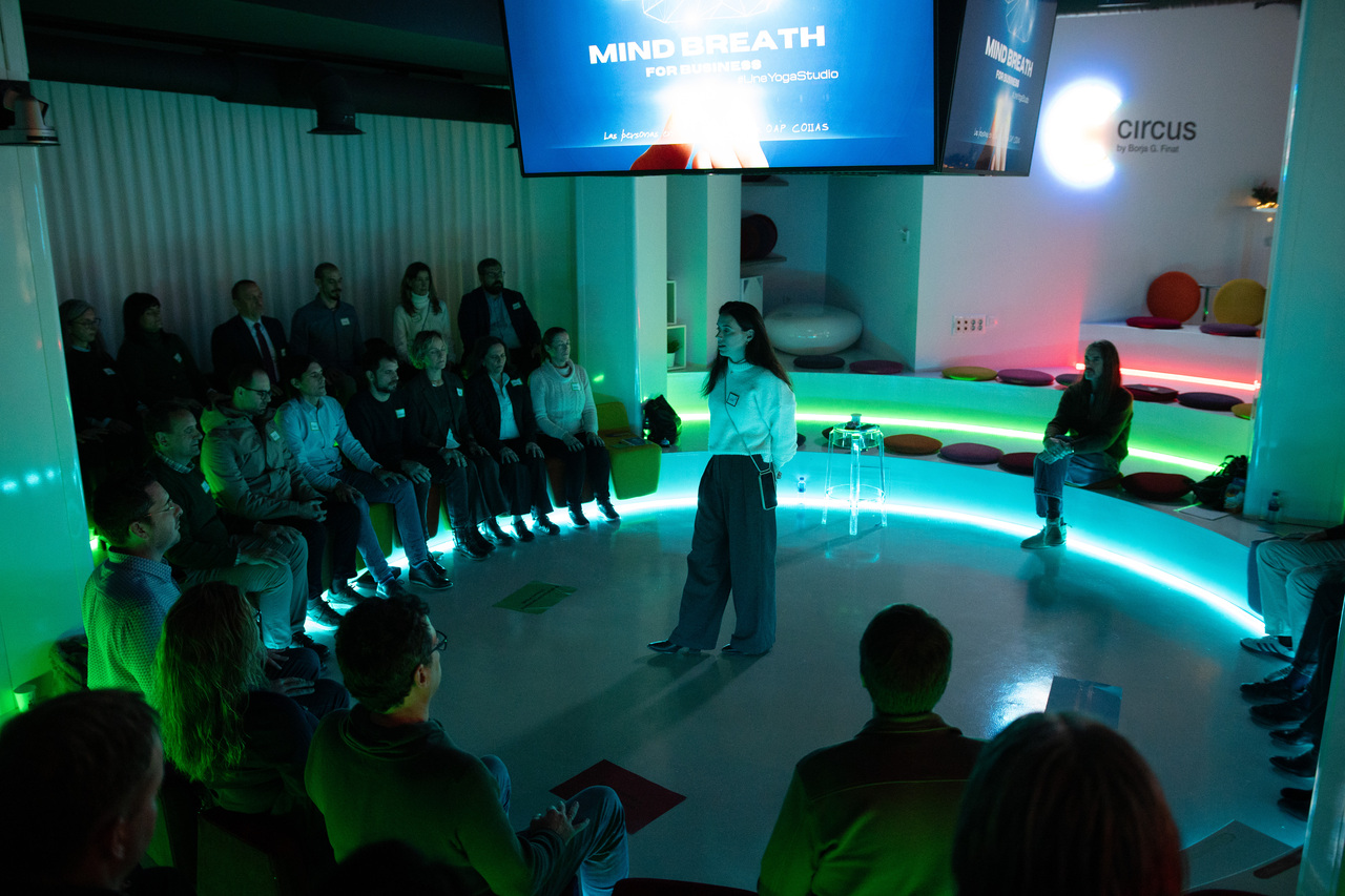 Tras una primera dinámica por parejas, el evento se detuvo en dos ocasiones -literalmente- para respirar. Nacho y Lucía, de Une Yoga Studio, guiaron a los asistentes en una breve sesión de ejercicios de conciencia corporal y respiración, concebida como un paréntesis para afrontar el día a día desde otra perspectiva. Un gesto simbólico que reforzó la idea de que la transformación empieza, siempre, por las personas.
