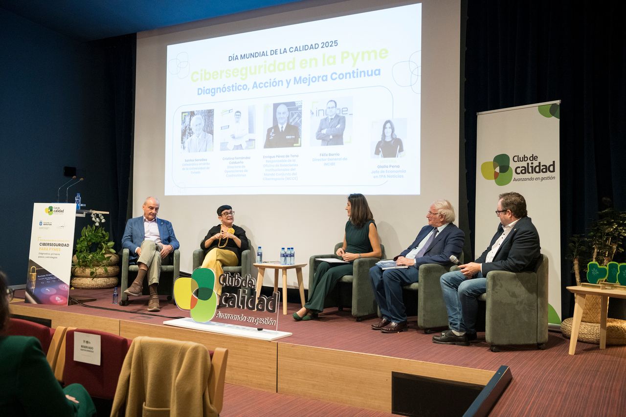 La mesa redonda posterior reunió a cuatro voces expertas que ofrecieron, bajo el título 'Ciberseguridad en la Pyme: Diagnóstico, Acción y Mejora Continua', una visión amplia del estado actual de este campo. Participaron en ella Santos González, catedrático emérito de Álgebra de la Universidad de Oviedo; Cristina Fernández, directora de Operaciones de Castroalonso; Enrique Pérez, responsable de la Oficina de Relaciones Institucionales del Mando Conjunto del Ciberespacio (MCCE); y Félix Barrio, director general del INCIBE. Se encargó de moderar el coloquio Olalla Pena, jefa de Economía en TPA Noticias.